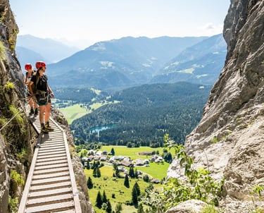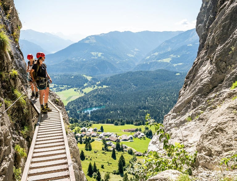 Set out on alpine adventures with our family-friendly (12 years and up) via ferrata – where laughter echoes along the cliffs and joy climbs with you.